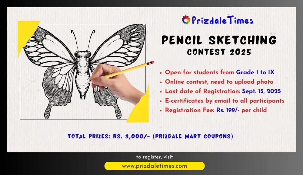 Prizdale Times announces the Prizdale Pencil Sketching Contest 2025, an online competition for students of Classes I to IX. This contest focuses only on sketching, encouraging children to express their creativity through lines, shading, and imagination without the use of colours or decorative materials.
